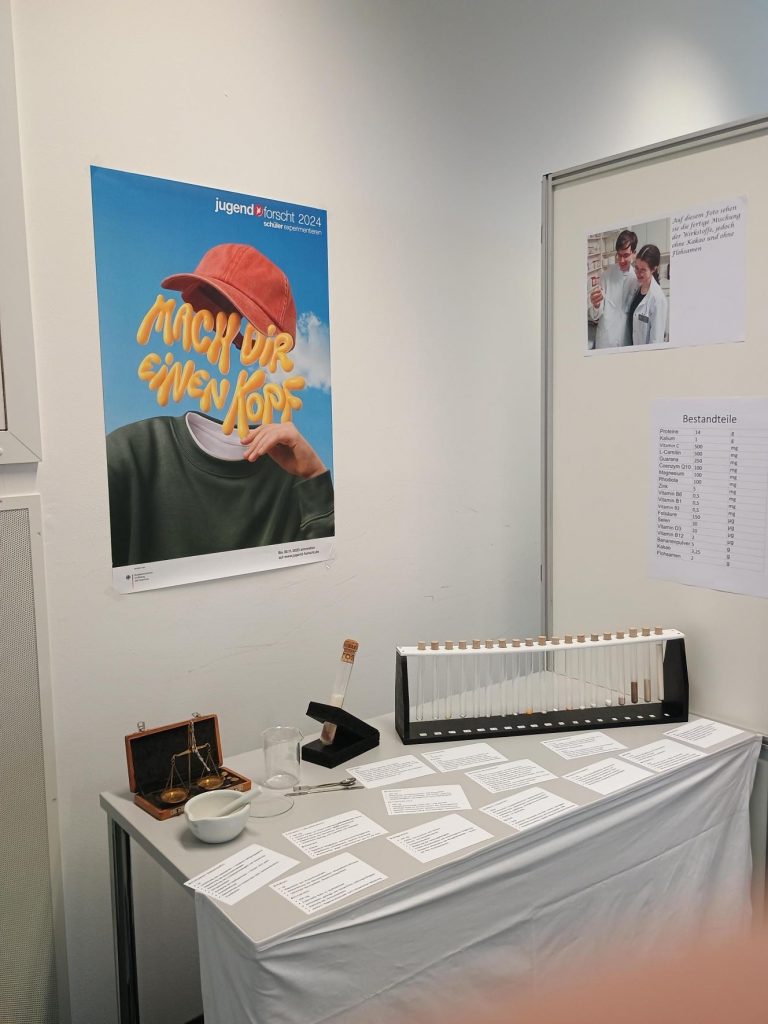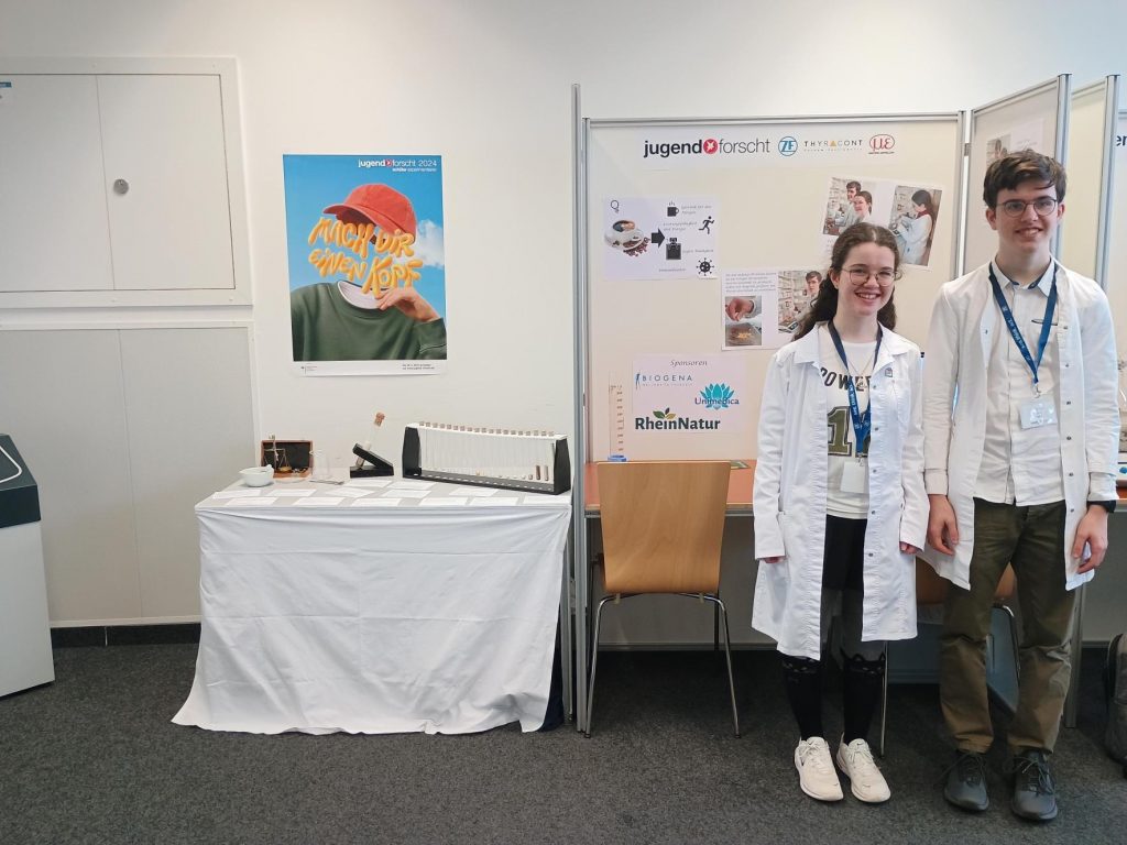 Mühevoll hatten Anna und Jakob ihren Stand gestaltet. Die Plakate hingen, die Power Point Präsentation lief und die Ausrüstung lag bereit. Es war also alles für die Jury angerichtet. Waren sie vor dem Gespräch noch etwas angespannt, wussten die zwei Chemiker in dem fast 30-minütigen Jury-Gespräch zu überzeugen.