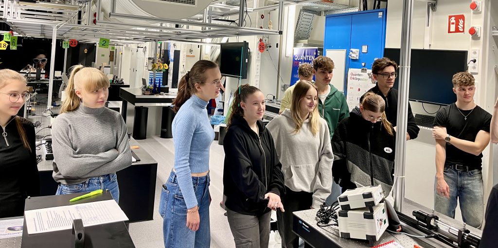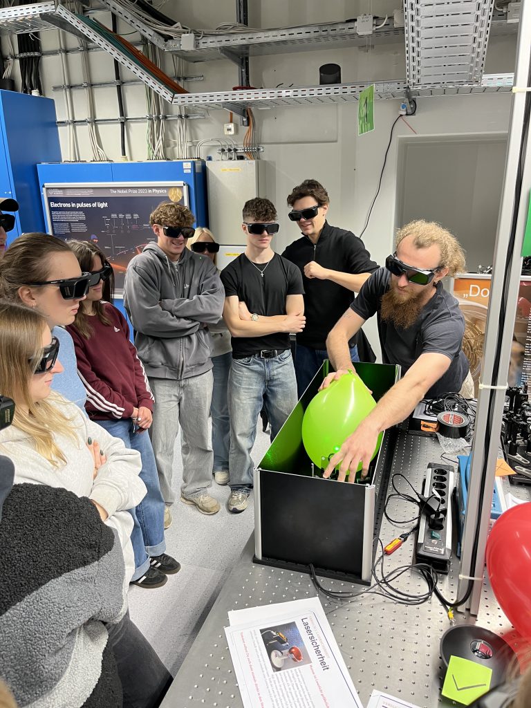 Die zweite Gruppe aus der Q13 besuchte vormittags das Schülerlabor PhotonLab des Max-Plank-Instituts für Quantenoptik. Dort durften die Schülerinnen und Schüler nach einer kleinen historischen Einführung über den ersten Laser, den Theodore Maiman in den 1960er Jahren entwickelt hat, selbst Experimente mit Lasern durchführen. Auch das Thema Sicherheit beim Experimentieren kam nicht zu kurz – nach dem eindrucksvollen Knall beim Zerplatzen eines laserbeschossenen Luftballons war jedem Teilnehmer klar, warum er die Schutzbrille während der Experimente tragen sollte!