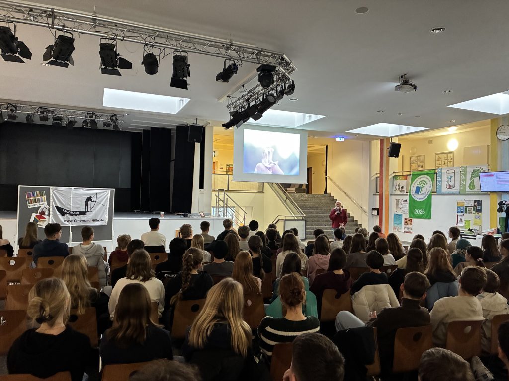Am 04. Dezember 2025 erlebten die 8. Klassen des Karl-von-Closen-Gymnasiums einen besonderen Vortrag in der Aula: Auf Einladung des Arbeitskreises Fairtrade berichtete die Menschenrechtsaktivistin Christina Haverkamp über ihre langjährige Arbeit mit den Yanomami, einem der letzten ursprünglich lebenden Naturvölker Amazoniens.