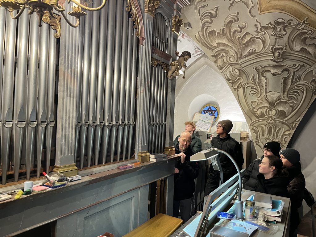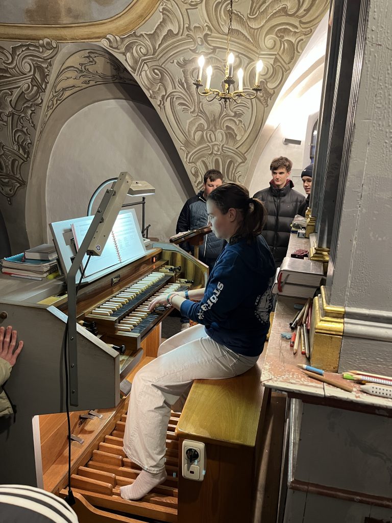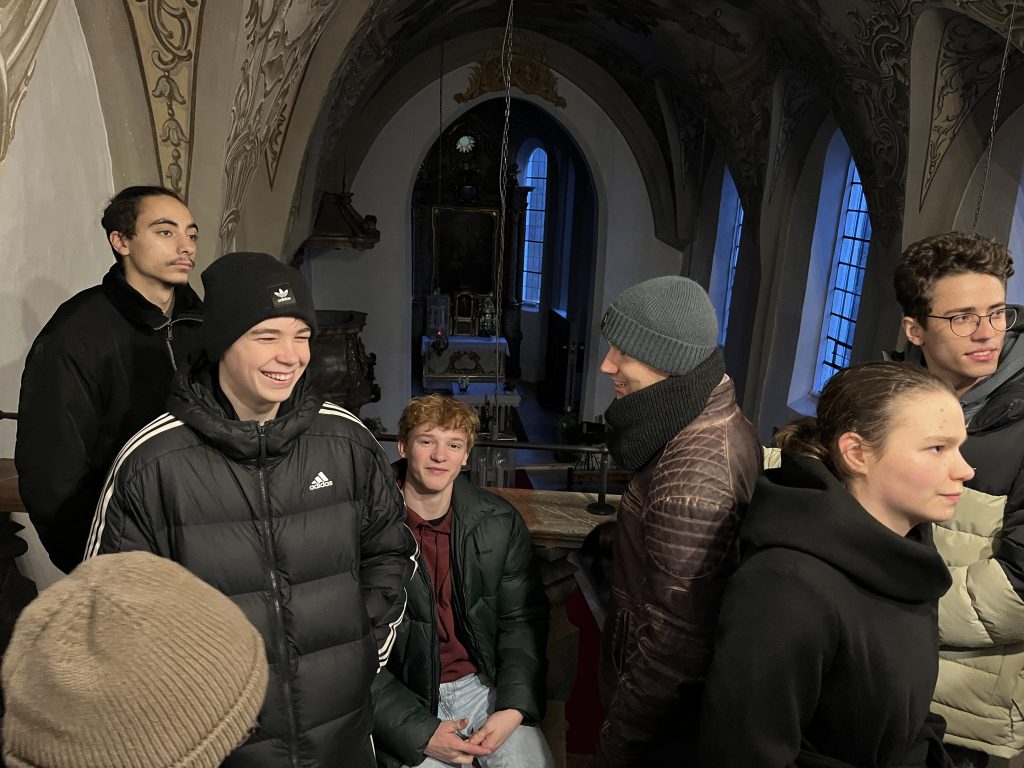 Das Innenleben einer Orgel haben vermutlich noch nicht viele Menschen zu Gesicht bekommen – die Schülerinnen und Schüler des W-Seminars „Physik und Musik“ schon! Auf Initiative ihrer Seminarleiterin Andrea Renner durften sie unter fachkundiger Leitung von Herrn Armin Vogl aus Osterhofen die Orgel in St. Georg in Gern erkunden. Der gelernte Orgelbauer hatte in den Wochen zuvor die Orgel gereinigt, defekte Teile ersetzt und das Instrument wieder neu gestimmt. Für das W-Seminar kam er eigens noch einmal nach Gern und öffnete die Seitenabdeckungen des Instruments, so dass man von allen Seiten die 728 Pfeifen, zugehörigen Windladen und Registerschleifen betrachten konnte. Fasziniert konnten alle verfolgen, wie das Drücken einer Taste auf dem Manual zum Ton an der entsprechenden Pfeife führte – oder auch an vielen gleichzeitig, wenn mehrere Register gezogen wurden.