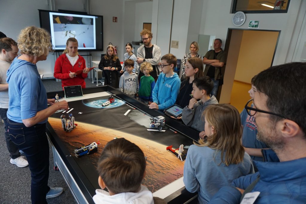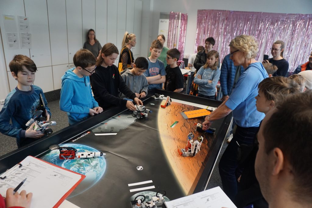 Die Teilnehmerinnen des Wahlkurses TEE (Technik entdecken und erleben) lieferten sich einen spannenden Wettkampf: Innerhalb von drei Minuten musste ein selbst gebauter und programmierter Roboter verschiedene Aufgaben der sogenannten „Lego Robotik Mars-Challenge“ absolvieren und dabei Punkte sammeln. Die zahlreichen Zuschauer fieberten mit den Teams mit und freuten sich über die gelungene Präsentation.