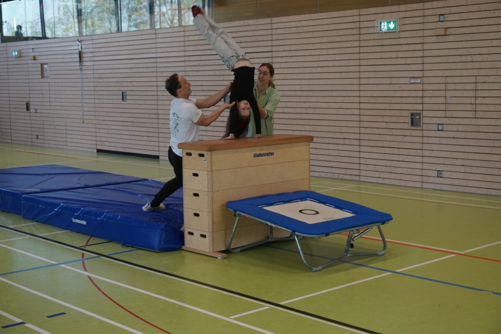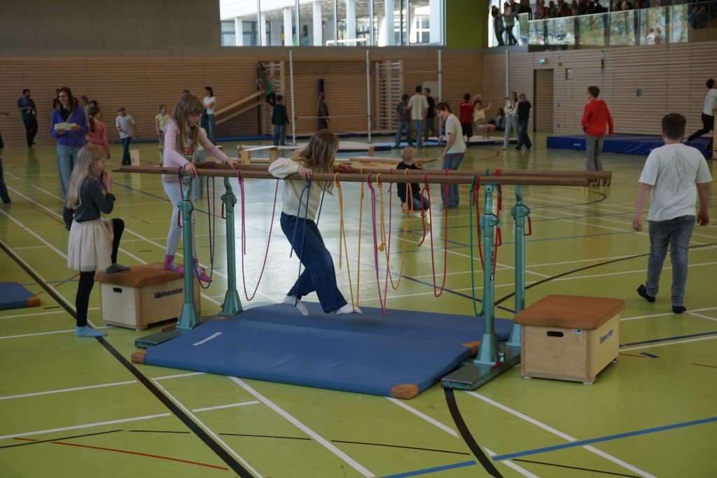 Der Abenteuer-Parcours, der von der Fachschaft Sport in der Dreifachturnhalle aufgebaut wurde, erfreute sich sehr großer Beliebtheit. Kinder und Jugendliche, aber auch so manche Erwachsene ließen ihrem Bewegungsdrang freien Lauf und hangelten, schwangen, sprangen, rutschten und kletterten von einem Hindernis zum nächsten. Die umfangreiche Ausstattung der Sporthallen ermöglicht nicht nur am Tag der offenen Tür, sondern auch im Unterricht, abwechslungsreiche und herausfordernde Stationen, deren Bewältigung großen Spaß bereiten und sehr großen Anklang bei den Besuchern und Kindern fand.