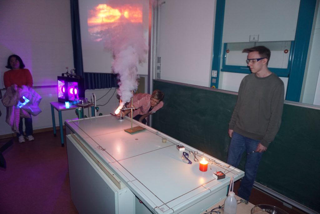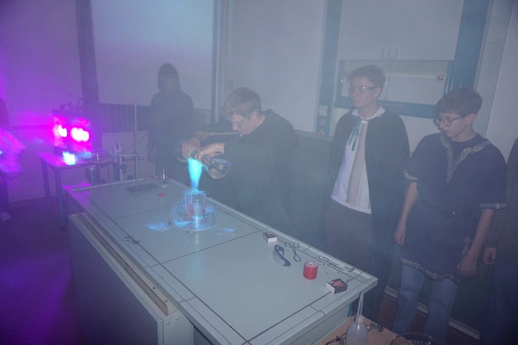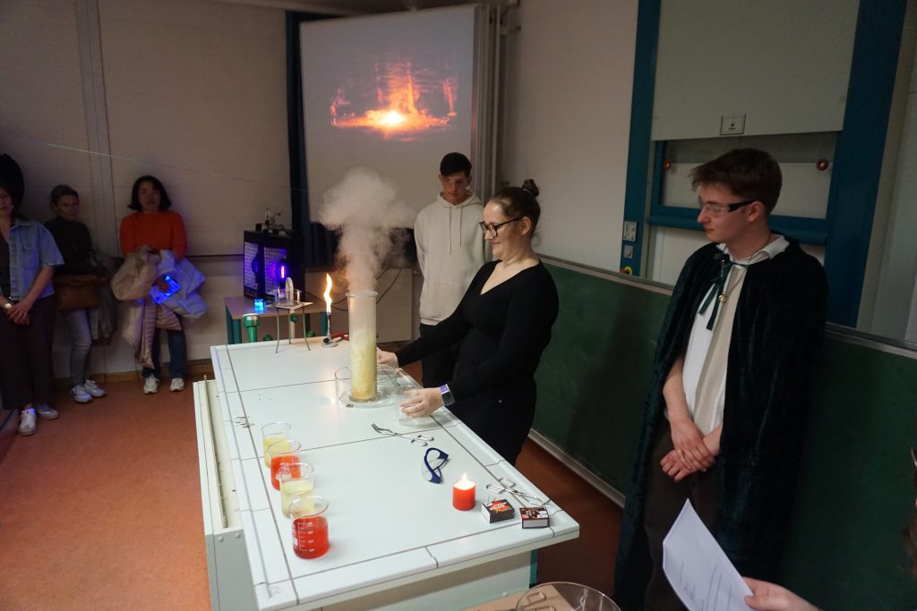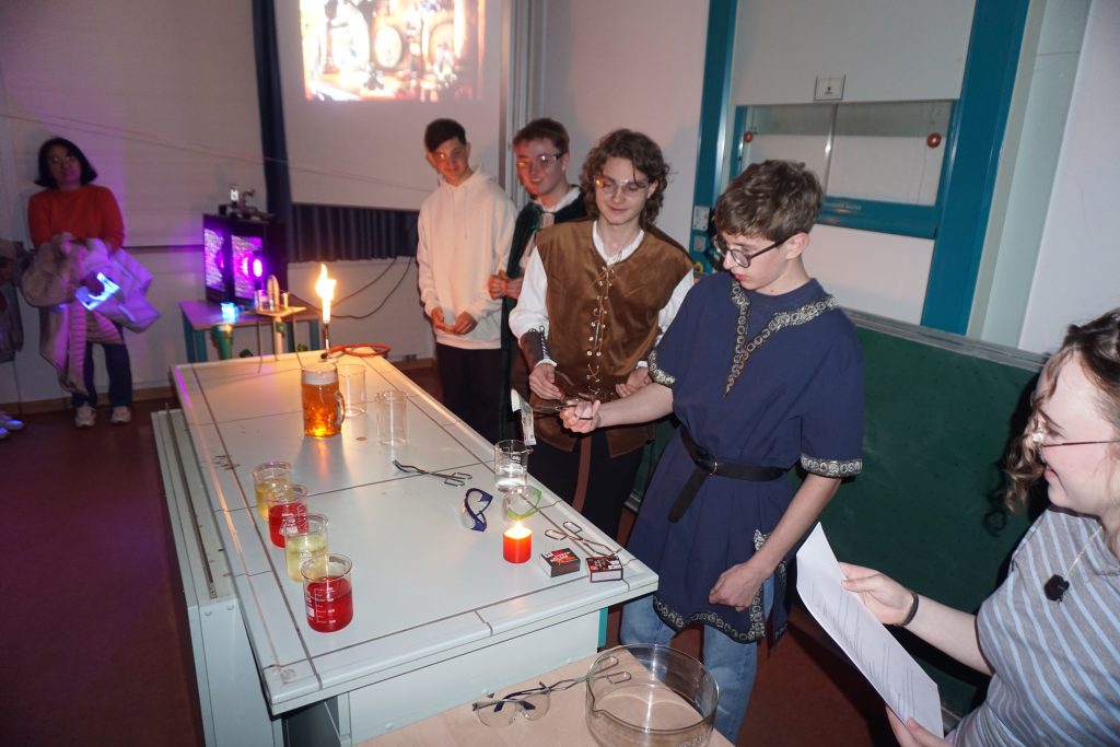 In den Chemiesälen erwartete die Gäste ein Feuerwerk für die Sinne: Kleine Vulkane spuckten Lava, Bunsenbrennerflammen leuchteten in Rot, Grün und Blau, winzige Boote glitten scheinbar von Geisterhand übers Wasser, und selbstgebaute Lavalampen blubberten in bunten Farben. Höhepunkt war die Experimentalshow des P-Seminars – eine spektakuläre Reise durch die Welt der Chemie, verpackt in eine Geschichte nach dem Vorbild von „Herr der Ringe“.